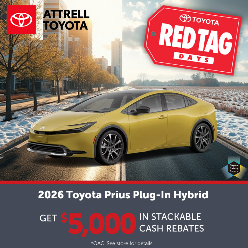 *Selling Price of a new and previously unregistered new and previously unregistered 2026 Prius Plug-In Hybrid SE (ACAAUC A) is $43,212 and includes $1,860 Delivery and Destination charge; $100 A/C charge; up to $999 retailer administration fee; $22 OMVIC fee; $20.00 EHF (tires)**; $1.22 EHF (filters) as well as all other applicable fees, levies and duties (all of which may vary by retailer). License; insurance; registration and applicable taxes are extra. Advertised offers applicable in Ontario only. Retailer may sell for less. Retailer order/trade may be necessary (but may not be available in all cases). Conditions apply. Offers ends March 31, 2026 and is subject to change or cancellation without notice. See your participating Ontario Toyota dealer or visit Toyota.ca for details