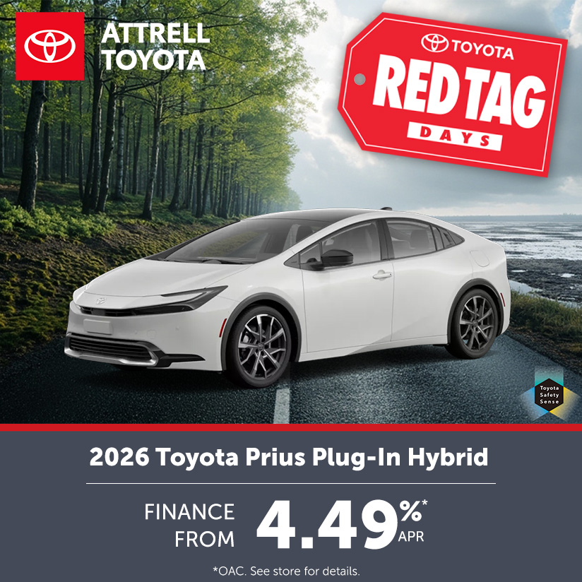 ‡Limited time finance offer available through Toyota Financial Services, on approved credit. Representative finance offer based on a new and previously unregistered 2026 Prius Plug-In Hybrid SE (ACAAUC A). Selling price is $43,212 and includes $1,860 Delivery and Destination charge; $100 A/C charge; up to $999 retailer administration fee; lien registration fee (up to $56), lien registering agent fee (up to $4); $22 OMVIC fee; $20.00 EHF (tires)**; $1.22 EHF (filters) as well as all other applicable fees, levies and duties (all of which may vary by retailer). License; insurance; registration, and applicable taxes are extra. $35,712.22 financed at 4.79% APR $154.52 weekly with 260 weekly payments required.$0 down payment and $0 security deposit required. Cost of borrowing is $4,463.44 for a total obligation of $40,175.66. Advertised offers applicable in Ontario only. Retailer may sell for less. Retailer order/trade may be necessary (but may not be available in all cases). Conditions apply. Offers ends March 31, 2026 and is subject to change or cancellation without notice. See your participating Ontario Toyota dealer or visit Toyota.ca for details