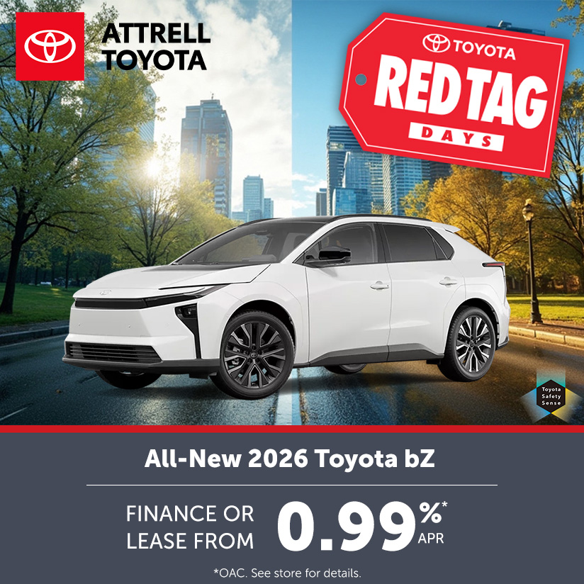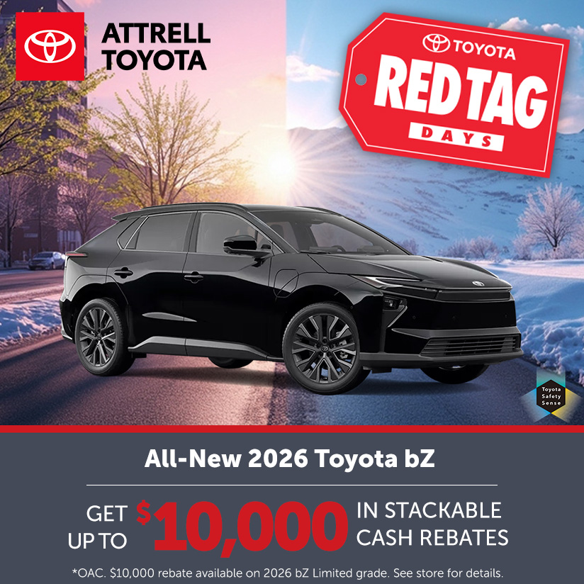 Up to $5,000 Electric Vehicle Affordability Program (EVAP) incentive available only to eligible Canadian residents for qualifying transactions (that meet the EVAP program eligibility criteria) of a 2026 Toyota bZ XLE FWD model with a final transaction value not exceeding $50,000 (calculated in accordance with the EVAP program terms), from a participating Toyota dealer in Canada between March 3, 2026 and March 31, 2026 (or until available funds are exhausted). The EVAP incentive: (i) is only available on the purchase, finance or lease (48 month term or more) of an eligible vehicle, with shorter lease terms qualifying for a lesser incentive amount; (ii) will be deducted from the vehicle’s negotiated selling price after taxes; (iii) is provided on a first-come, first served basis or until available funds are exhausted; and (iv) cannot be applied to past transactions. Limit of one (1) EVAP incentive per person during the lifetime of the program. To learn more about the EVAP’s terms, eligibility requirements and restrictions, visit: https://tc.canada.ca/en/road-transportation/innovative-technologies/zero-emission-vehicles/electric-vehicle-affordability-program-evap, or your local Toyota retailer. Toyota Canada makes no representations about the actual amount of or eligibility for the EVAP incentive, and is not responsible for the incentive (which is administered exclusively by the Government of Canada, and subject to change/termination at any time). EVAP information is provided for informational purposes only.*